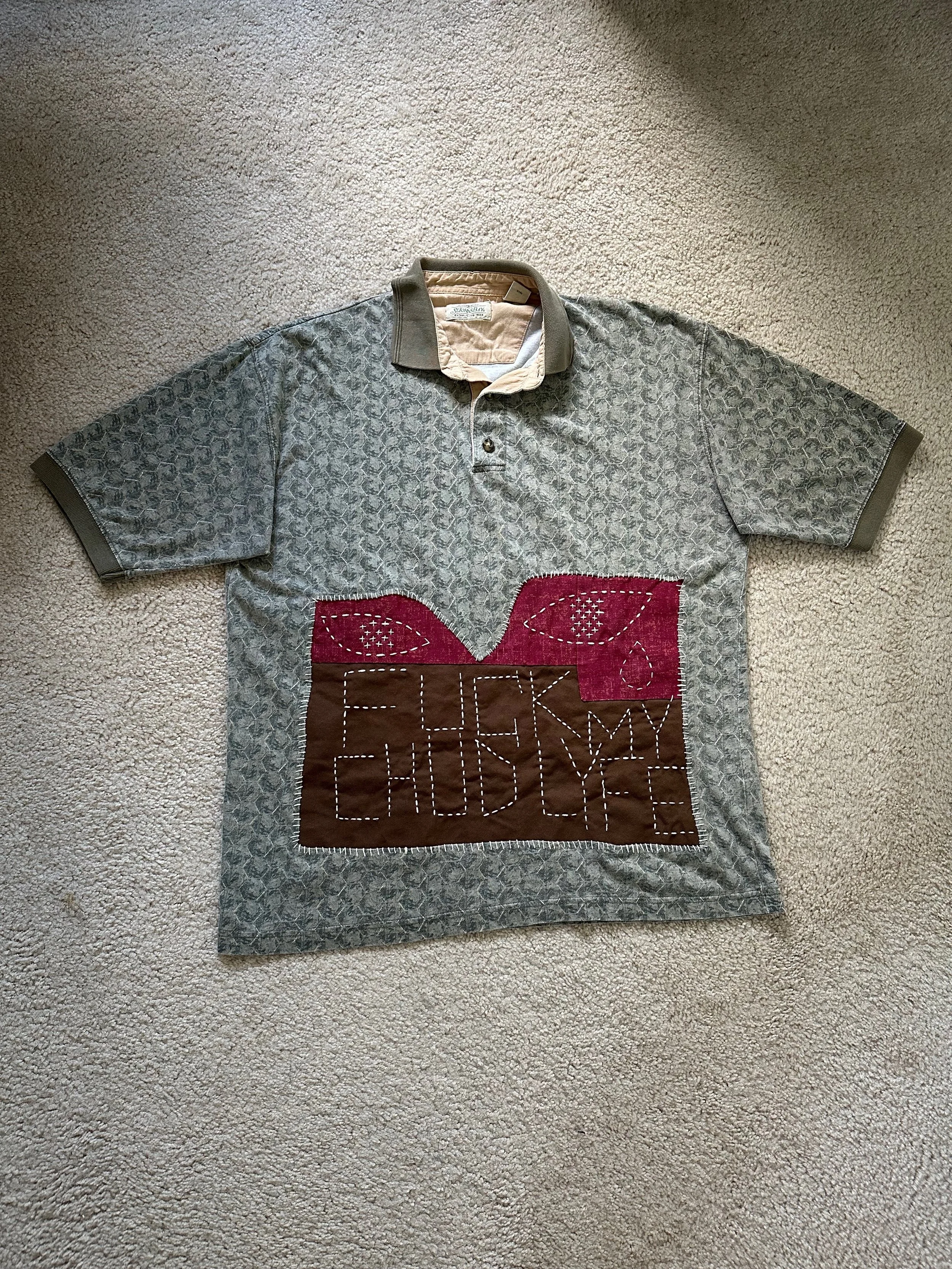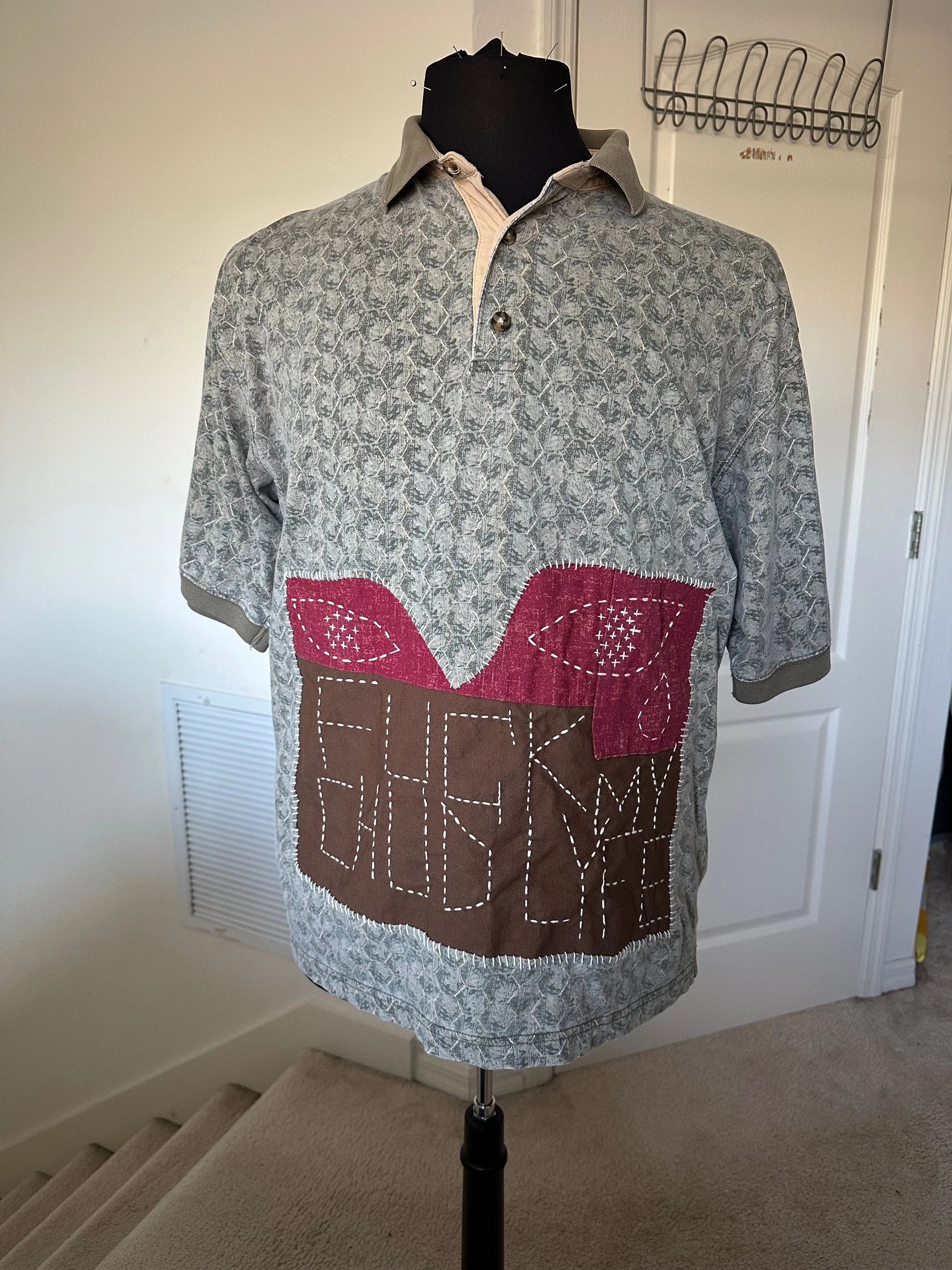 The piece was created by upcycling a polo shirt from my personal wardrobe. The graphic area was cut out and reinforced with a backing fabric, which was secured to the garment using whip stitching along the edges.