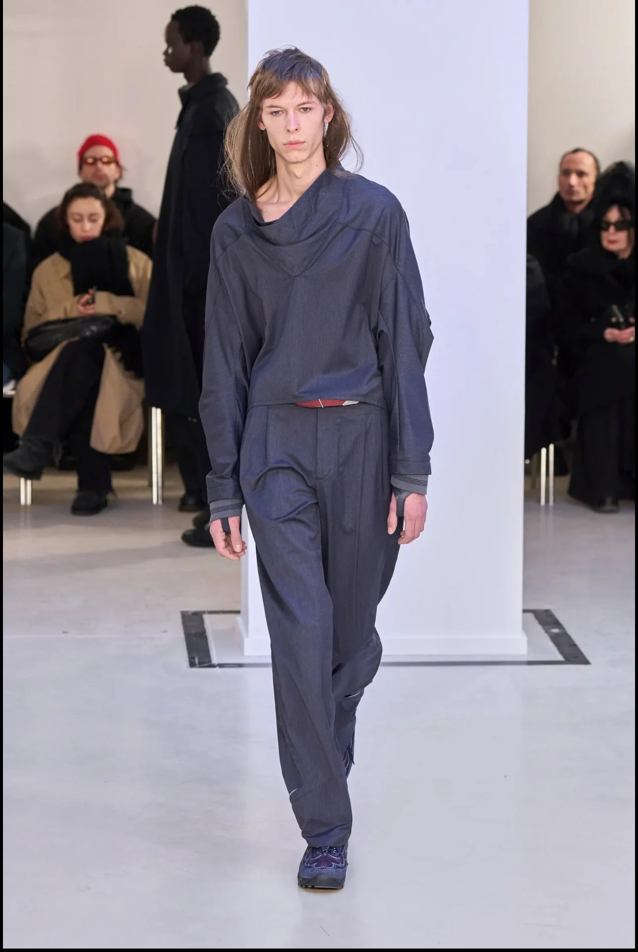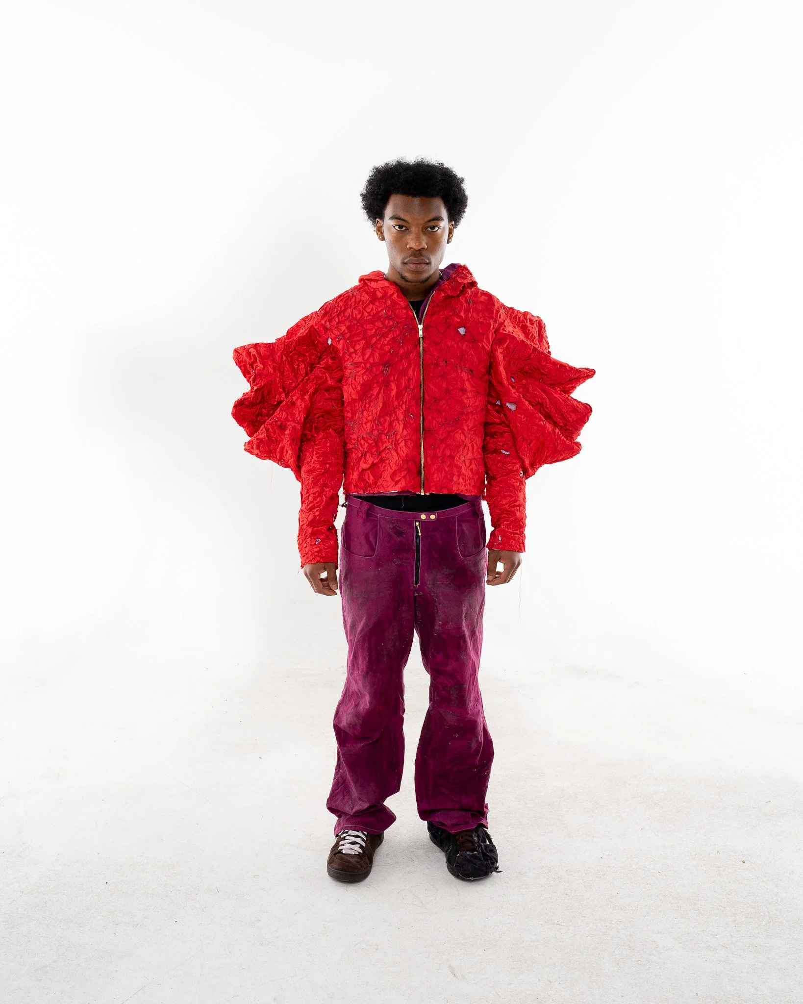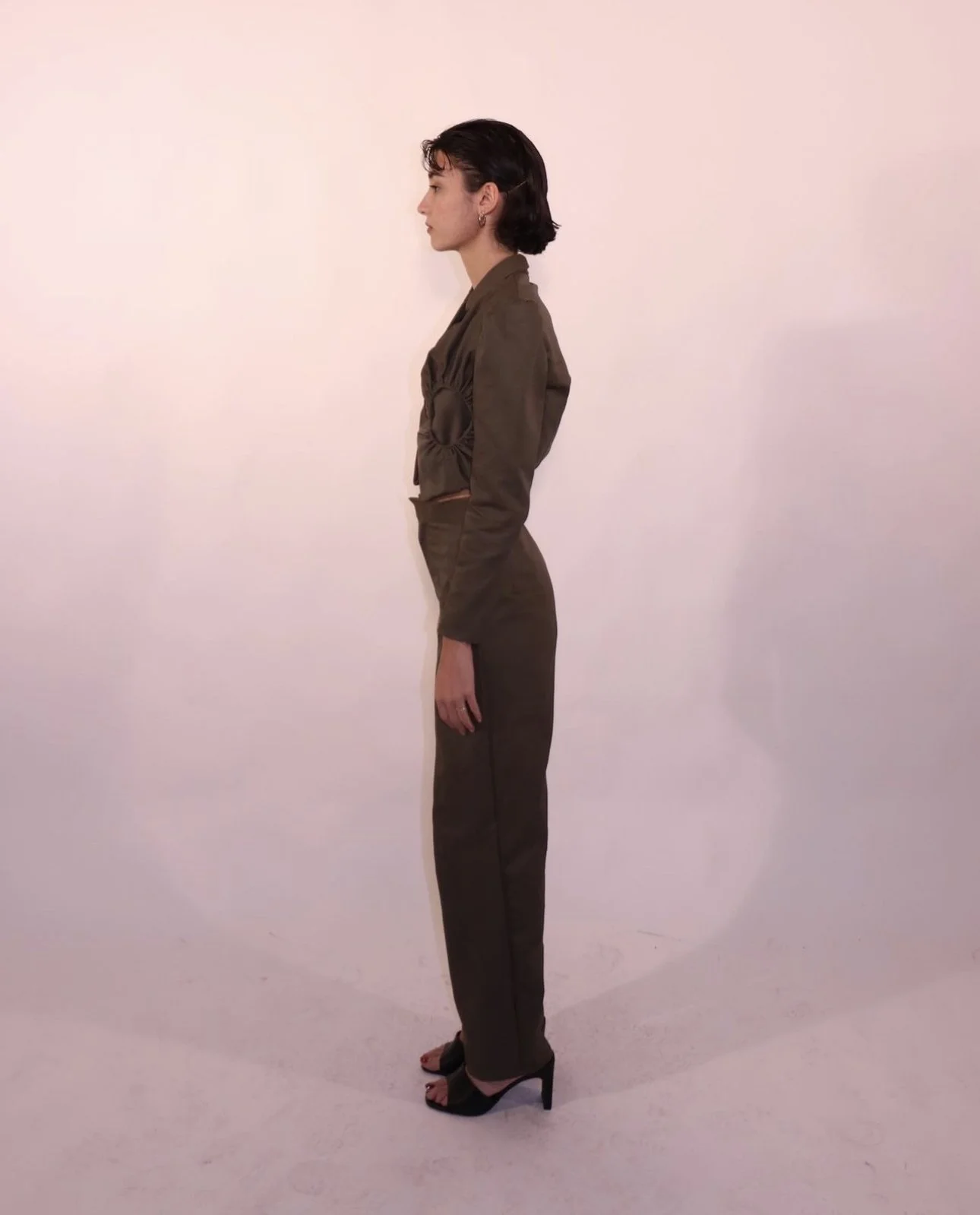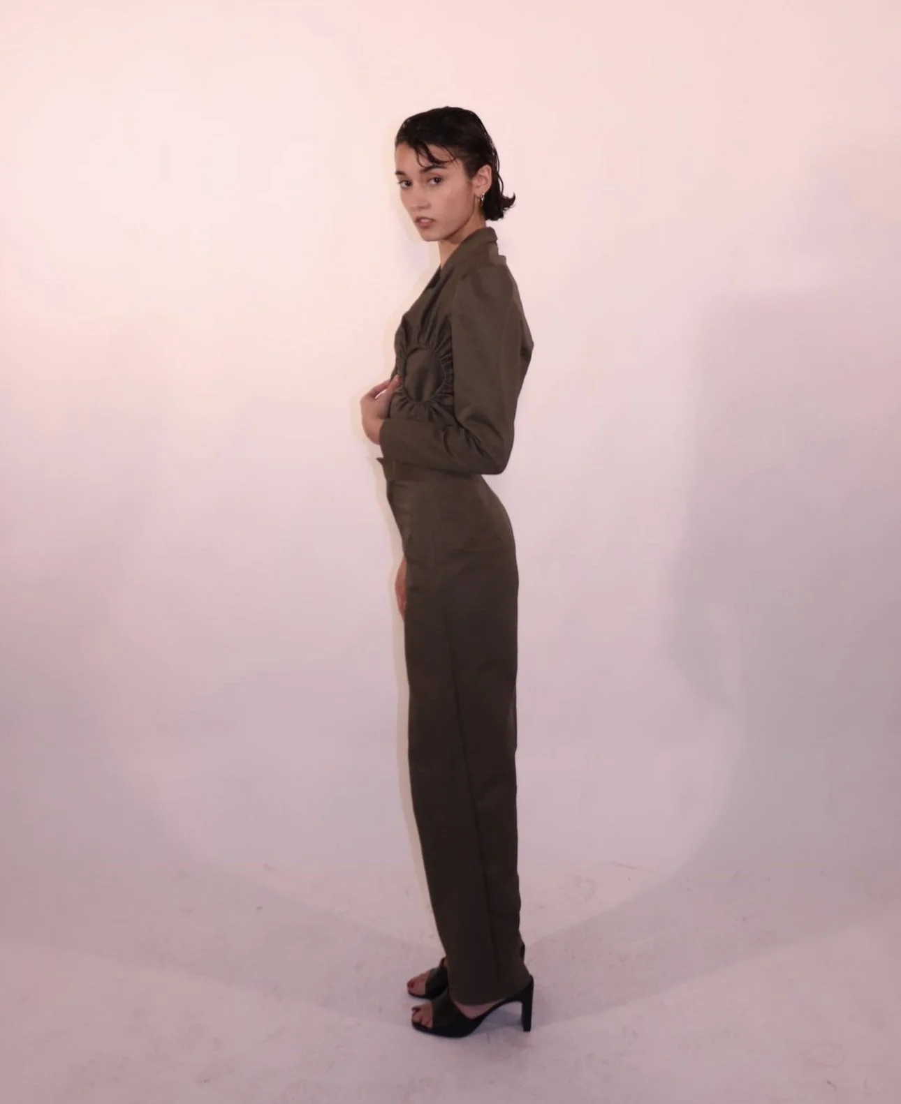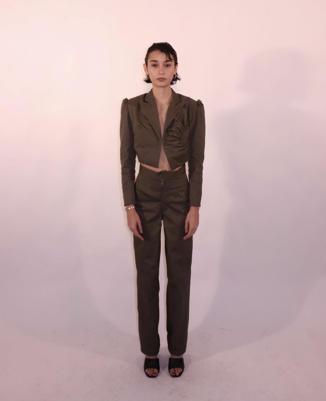This look is crafted from 100% olive green twill cotton, featuring a jacket designed with a sculptural gathered shoulder, reinforced with embedded shoulder pads for added structure. The design incorporates the innovative “gathered hole” technique, inspired by Pattern Magic, showcasing my exploration of avant-garde construction and dimensional form.